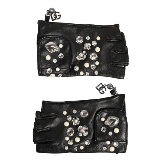 Dolce & Gabbana Black Leather Embellished Long Mitten Gloves