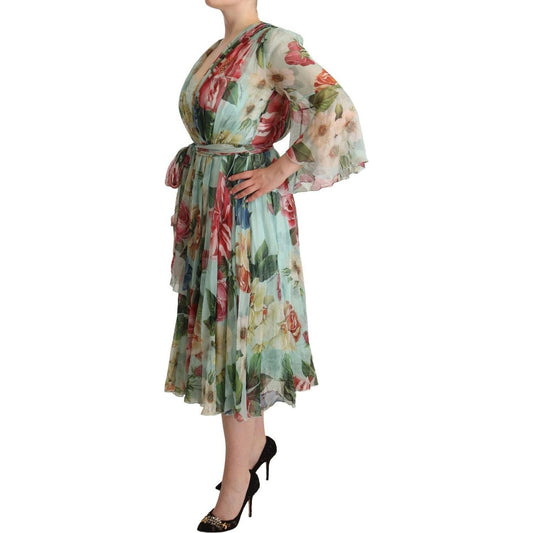 Dolce & Gabbana Green Floral Long Sleeves V-neck Midi Dress