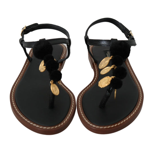 Dolce & Gabbana Black Leather Coins Flip Flops Sandals Shoes