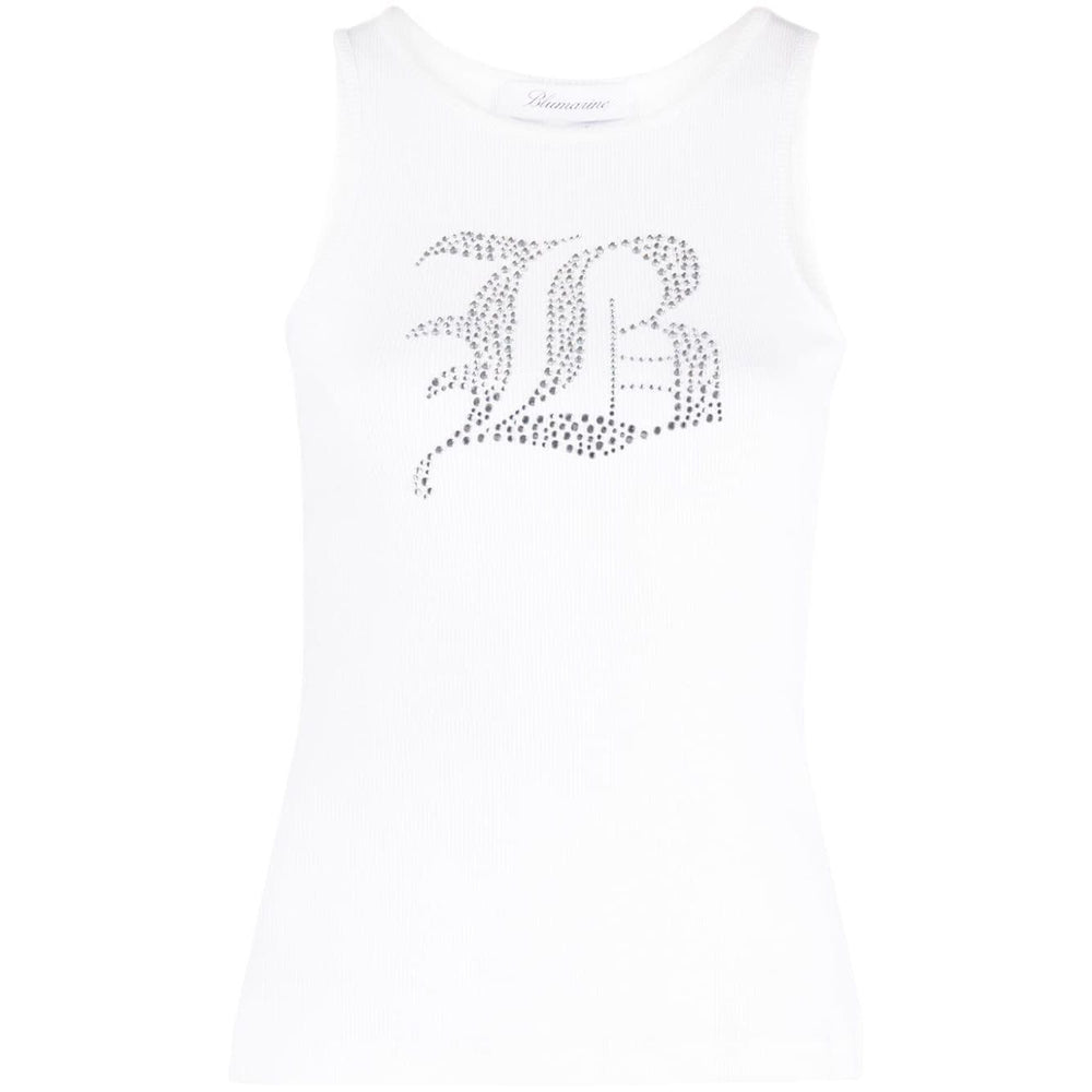 rhinestone-logo ribbed tank top from BLUMARINE featuring optical white, stretch-cotton, fine ribbed, rhinestone embellishment, round neck, short sleeves and straight hem. Logo ribbed cotton tank top Size and Fit - This piece fits true to size. We recommend you get your regular size. Model is 1,75m / 5ft 8in wearing size S