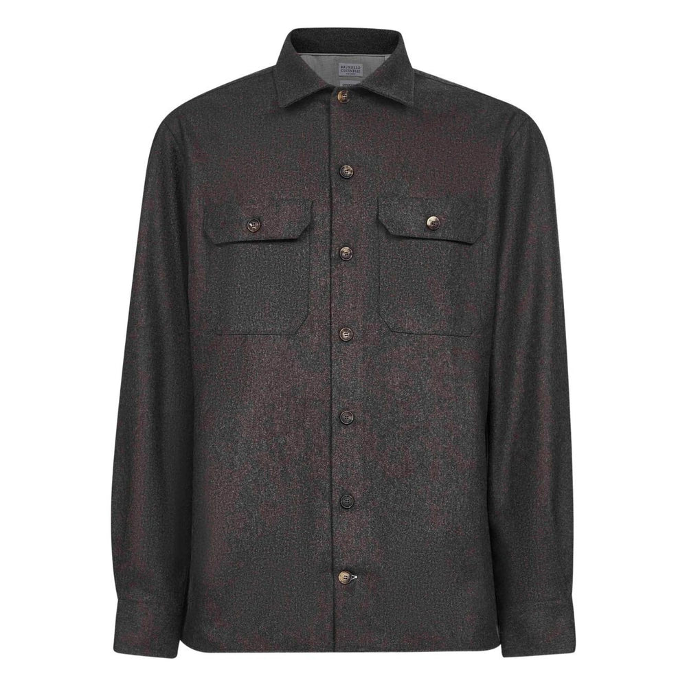 • Brunello Cucinelli Long-sleeve flannel overshirt, brown wool with buttoned cuffs, polo collar, and chest pockets.