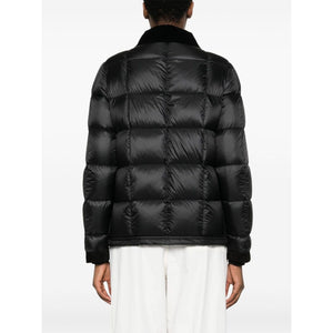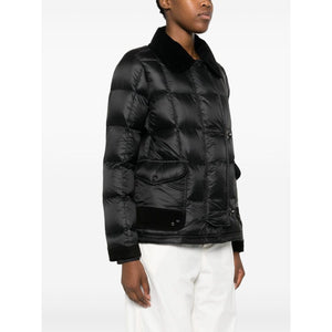 classic-collar quilted down jacket from FAY featuring black, goose down, quilted, padded design, suede trim, logo patch to the front, corduroy collar, classic collar, hook fastening, long sleeves, two press-stud fastening side pockets and straight hem. Nylon down jacket Size and Fit - This piece fits true to size. We recommend you get your regular size. Model is 1,75m / 5ft 8in wearing size S
