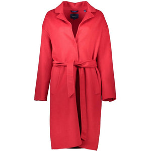 long-sleeved coat, 2 external pockets, belt at the waist, press studs, logo