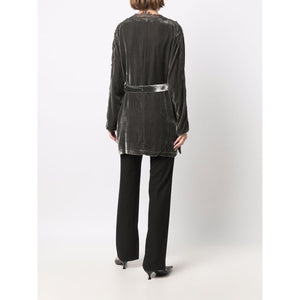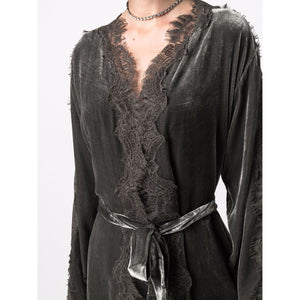 Dark grey lace-trim belted coat from GOLD HAWK featuring lace trim, V-neck, long sleeves, tied waist and two side slit pockets. Velvet long duster Size and Fit - This piece fits true to size. We recommend you get your regular size. Model is 1,75m / 5ft 8in wearing size S
