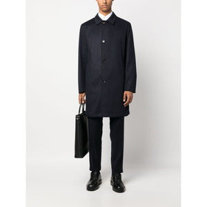 navy blue cashmere spread collar front button fastening long sleeves thigh-length straight hem Peak cashmere coat Size and Fit - This piece fits true to size. We recommend you get your regular size<br>Model is 1,84m / 6ft 1in wearing size 48 (IT).