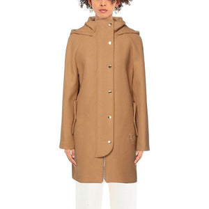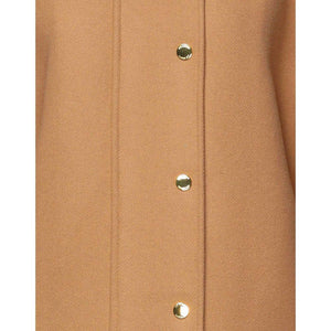 Step out in style with the chic Love Moschino coat, an embodiment of elegance and modern flair. This sophisticated brown piece features a plush hood, exquisitely complemented by gold-tone buttons and a smooth zip closure that add a touch of luxury to your ensemble. Tailored from a harmonious blend of wool and polyamide, it promises warmth and durability with a dash of designer allure.