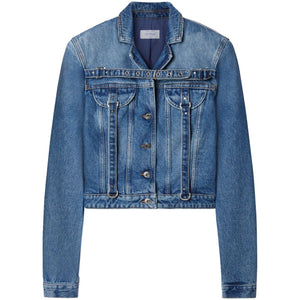 belt-detailed denim jacket from OFF-WHITE featuring blue, cotton, denim, notched collar, front button placket, long sleeves, buttoned cuffs, two chest flap pockets and straight hem. Cropped denim jacket Size and Fit - This piece fits true to size. We recommend you get your regular size. Model is 1,75m / 5ft 8in wearing size 40 (IT)
