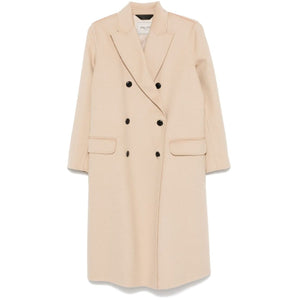 beige wool blend felted double-breasted button fastening peak lapels long sleeves two side flap pockets central rear vent partial lining straight hem long length Arianna wool double-breasted coat
