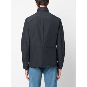 flap-pocket cotton-blend jacket from PEUTEREY featuring logo patch at the sleeve, concealed front fastening, long sleeves, four front flap pockets, navy blue, cotton blend and stand-up collar. Metal blouson jacket Size and Fit - This piece fits true to size. We recommend you get your regular size. Model is 1,84m / 6ft 1in wearing size M