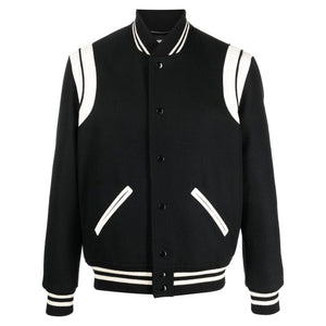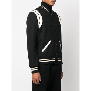 Inspired by Varsity codes, this black and white eddy bomber jacket from Saint Laurent is legendary. Worn by a cluster of celebrities, it boasts universal appeal that you'll want to be a part of. You'll want this one in your collection. Featuring a ribbed collar, a snap button closure, front welt pockets, long sleeves, a ribbed hem and cuffs, a full lining and a striped trim. Wool bomber jacket Size and Fit - This piece fits true to size. We recommend you get your regular size. Model is 1,84m / 6ft 1in wearing size 48 (IT)