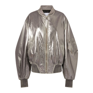 Color argento, pelle di agnello, effetto metallizzato, design a inserti, colletto a coste, chiusura frontale con zip, maniche con spalle scese, maniche lunghe, tasca con zip sulla manica, due tasche a filetto laterali, orlo e polsini a coste. Mirrored leather bomber jacket - Runway Size and Fit - This piece fits true to size. We recommend you get your regular size. Model is 1,75m / 5ft 8in wearing size 40 (IT)