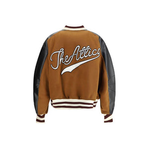 The Attico’s varsity bomber Jacket is made of wool cloth and features a front zipper closure. Ribbed collar, cuffs and hem give a sporty touch, while the two leather welt pockets add elegance. Paneled sleeves and a stitched logo on the front and back complete the garment’s distinctive design.