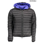 reversible jacket, blue-black, 2 external pockets, 2 internal pockets, zip, application, logo