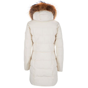 Yes Zee long quilted down jacket in softshell fabric, zip and button fastening, two front pockets, fur hood